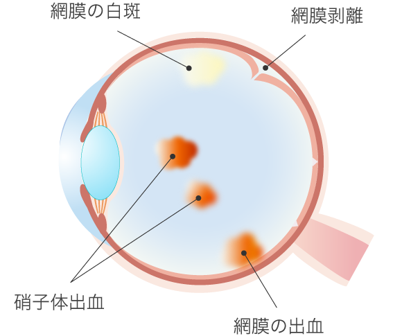眼内に広く出血する硝子体出血や増殖膜ができて、それによる牽引性網膜剥離、難治な血管新生緑内障など、様々な状態が引き起こされます。治療としては、レーザー治療はもちろん必要ですが、進行を阻止できない場合は、硝子体手術が必要になります。
